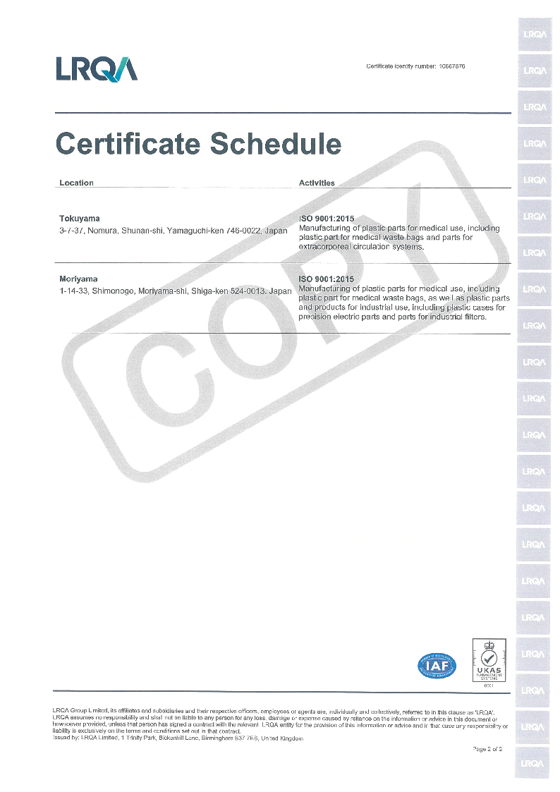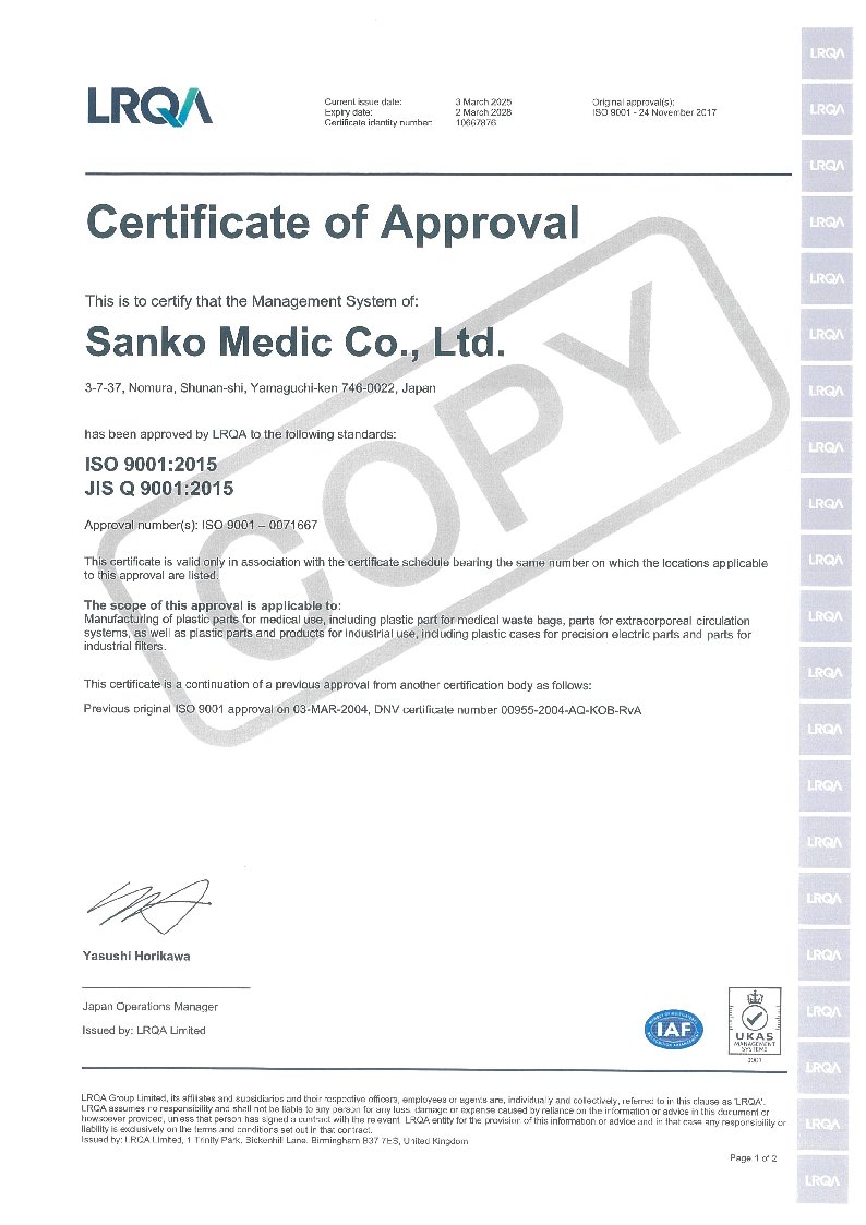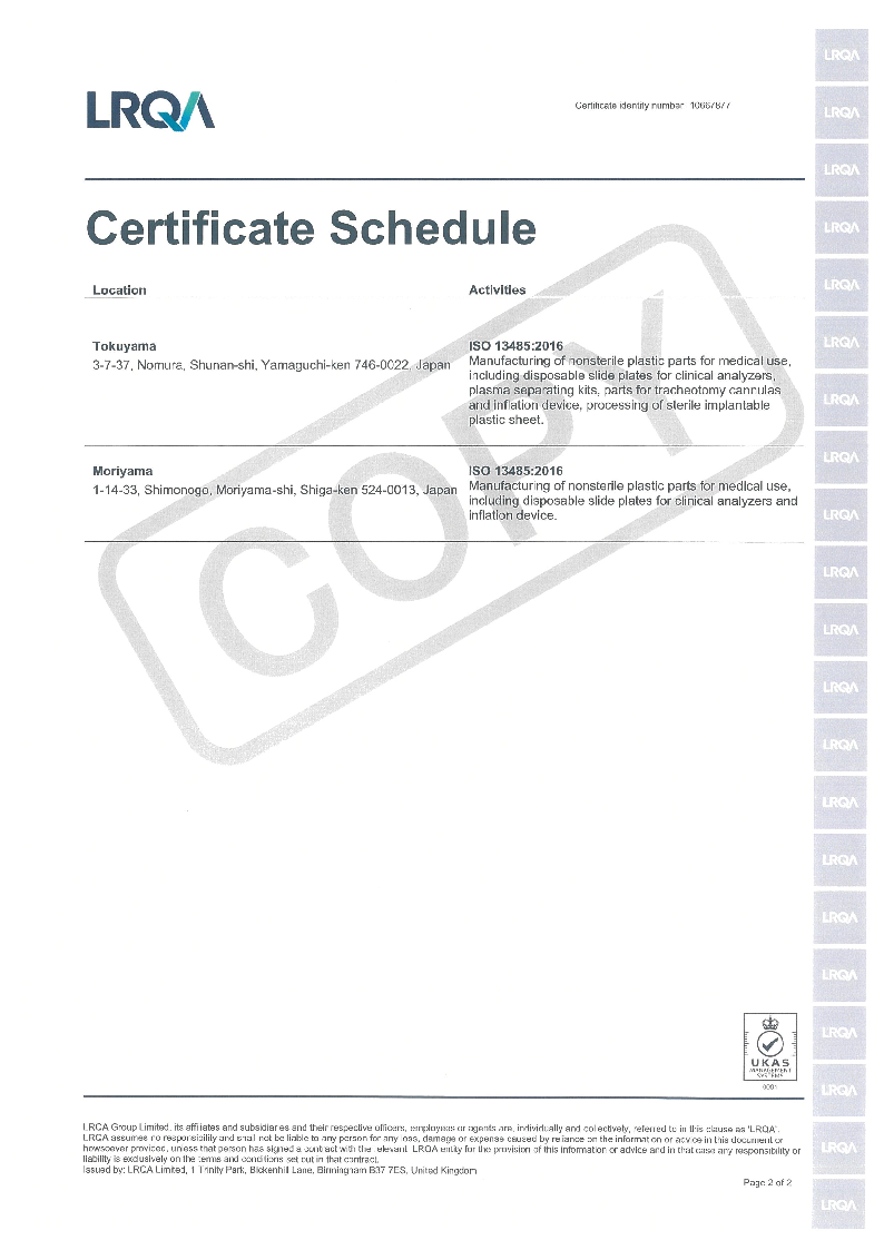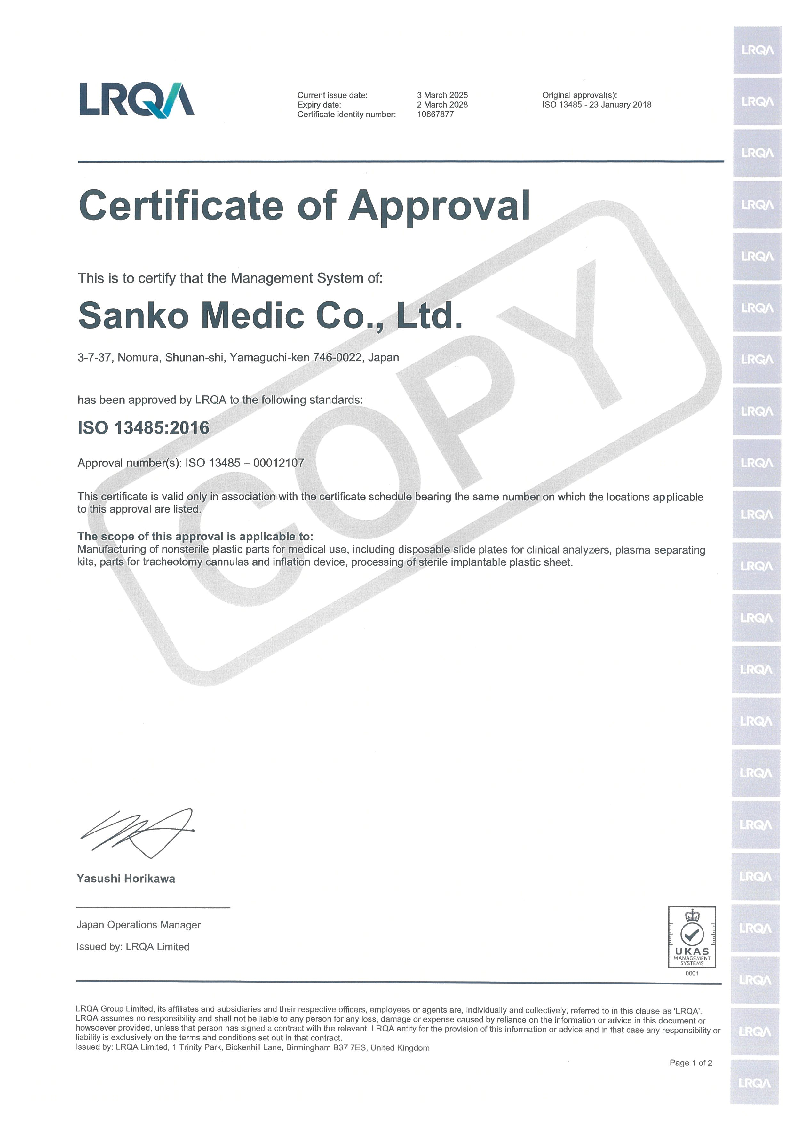 医療機器製造許可による徹底した品質管理 医療機器における品質マネジメントシステムの国際規格、品質マネジメントシステムの国際規格へ対応し、 すべてのプロセスにおいて徹底した管理体制を整えています。 認証証明書(認証機関:LRQA) ISO9001(1/2) ISO9001(2/2) ISO13485(1/2) ISO13485(2/2)